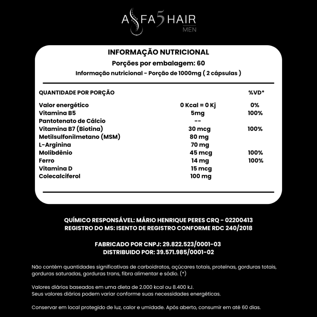 Todos os insumos usados na fabricação do Alfa5HAIR, incluindo a matéria-prima da tecnologia exclusiva 5AlfaRedusePRO, são importados e passam por uma fiscalização rigorosa, sendo aprovados pela ANVISA (Agência Nacional de Vigilância Sanitária), em todo o território brasileiro.